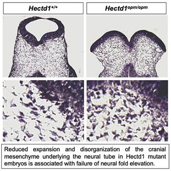 Neural tube defects are among the most common structural birth defects in humans and result in long-term disability or even death; yet, the underlying genetic causes remain largely unknown. Work in the Zohn Laboratory is guided by the idea that addressing this knowledge gap is best achieved by elucidating the mechanisms mediating both normal and abnormal development. Neural tube defects result from failure of the flat neural plate — the embryonic precursor to the central nervous system — to roll into a tube. In the head, morphogenesis requires movement of not only the cells in the neural plate but also the underlying cranial mesenchyme. Experiments conducted nearly 40 years ago suggest that expansion of the cranial mesenchyme, a cell population beneath the neural plate, is required for elevation of the cranial neural folds and neural tube closure. Yet, little is known regarding how expansion of the cranial mesenchyme drives neural fold elevation and how this process can be disrupted to cause neural tube defects. Moreover, few genes are implicated. To address these gaps in knowledge, we are utilizing a novel model of neural tube defects with a mutation in the Hectd1 gene. By comparing the cell movements in this model with those that occur during normal development, we aim to elucidate how disruption of cranial mesenchyme expansion can result in failure of neural tube closure.