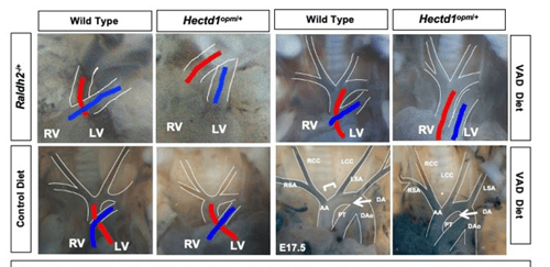 The Zohn Laboratory is addressing these gaps in knowledge utilizing novel models of congenital heart defects that interact with vitamin A signaling. Our data indicate that altering maternal vitamin A intake can preferentially impact the outflow tract or aortic arch depending upon whether signaling is increased or decreased. We hypothesize that this differential activity is due to alterations in specification of outflow tract and aortic arch progenitors in the second heart field. These studies have the potential to elucidate how environmental factors alter progenitor cell specification resulting in congenital heart defects.